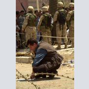 Jerome Delay photo of journalist Mark Fritz on the clock on June 18, 2003, outside the palace housing the U.S. Embassy. Roughly 400,000 ex-Iraqi soldiers demanded their paychecks for surrendering to the U.S. invasion. Trigger-happy Americans fired "warning shots" that killed two Iraqis. I repeatedly crossed barbed-wire to get both sides of the story.