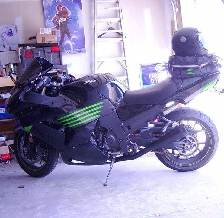 Journalist Mark Fritz in Raleigh, NC, with his 2009 Kawasaki ZX-14 Ninja with M4 drag pipes and a Power Commander V super tuner, which I can say in all modesty was the fastest street bike in Raleigh.