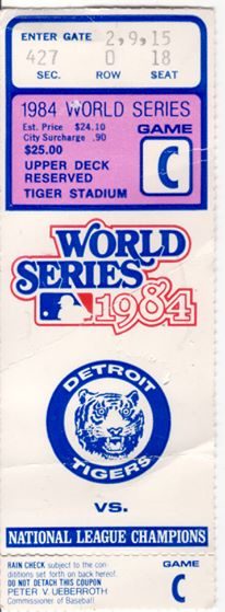 Ticket for the deciding 5th game of the 1984 World Series, Tigers over the San Diego. Detroiters celebrated the usual way: Setting cop cars on fire.
