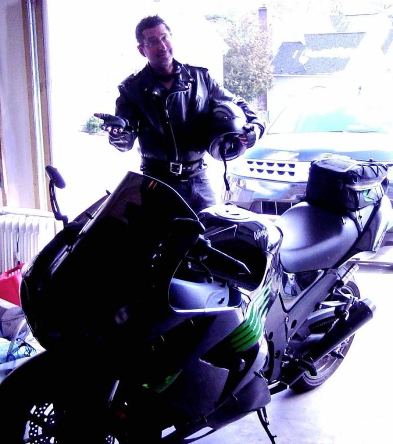 With my stepped-on 2009 ZX-14 Ninja; it's a distant successor to the 1973 Kawasaki H2 I rode from Kalamazoo to California in 1980. It was then the fastest motorcycle you can buy, as was this Ninja. Photo of journalist and motorcycle enthusiast, Mark Fritz
