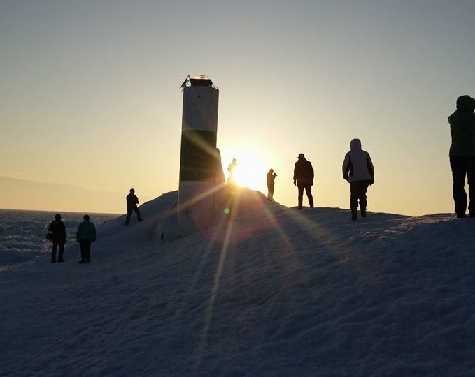 A Lake Michigan lighthouse sits stranded in ice during the cold winter of 2010. Visitors turned out in force to experience the big lake, frozen like a pond. Photo by journalist Mark Fritz.
